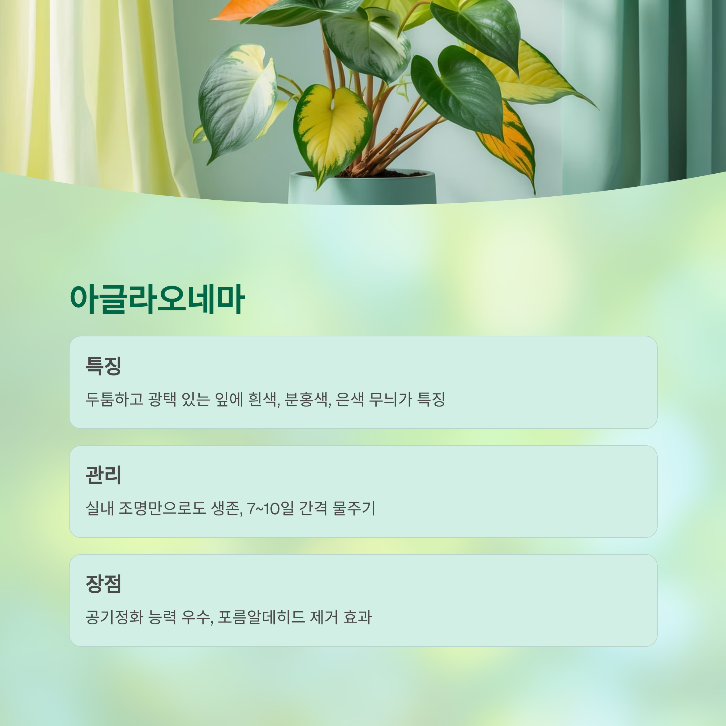 아글라오네마는 공기정화 능력도 좋아서 NASA 선정 ‘실내 공기 정화 식물’ 리스트에 올라있어요. 포름알데히드나 벤젠 같은 유해 물질 제거에 효과가 있답니다 🌬️
