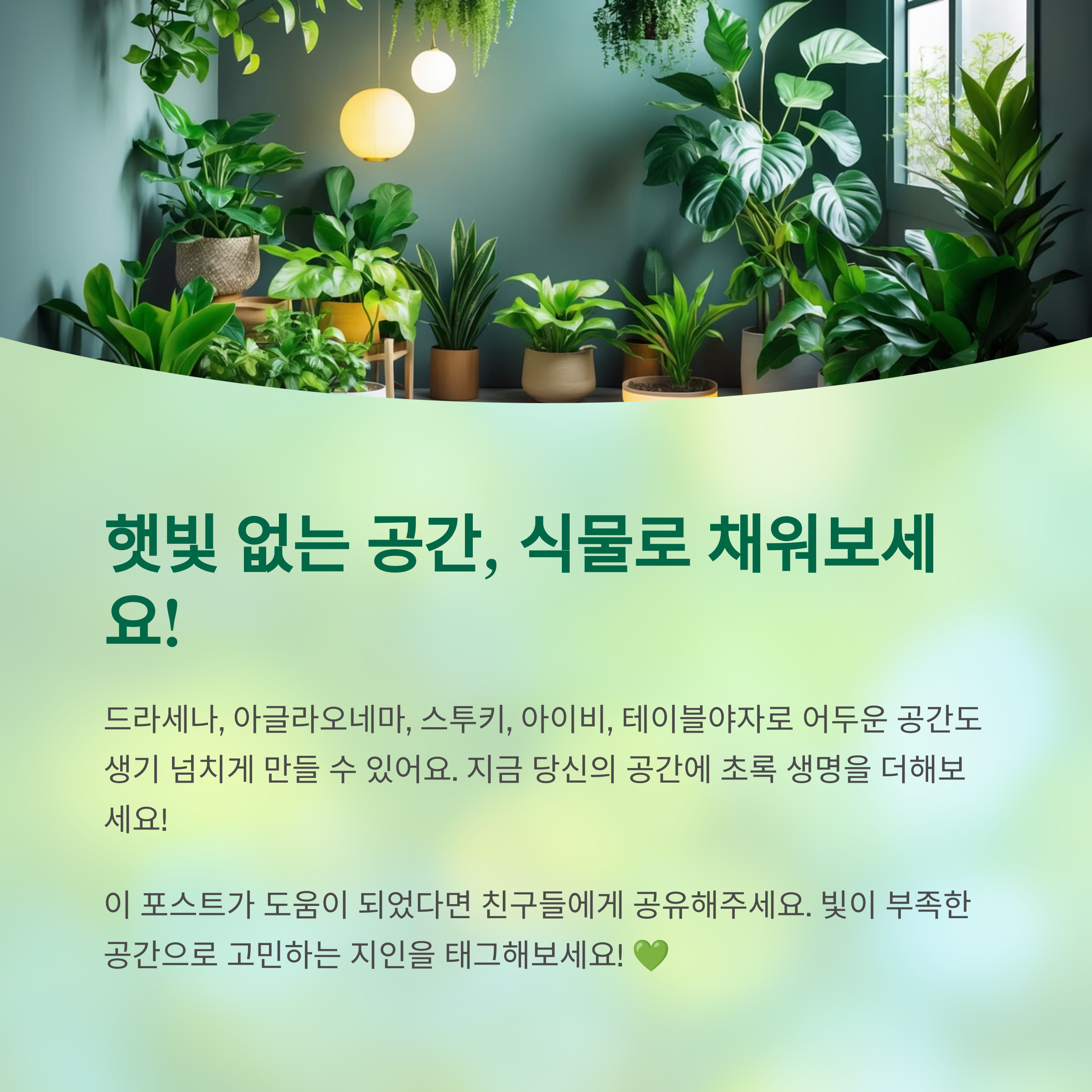 빛이 부족하다고 식물 키우기를 포기하지 마세요. 식물은 생각보다 강하고, 여러분의 작은 배려로도 아주 잘 자라준답니다. 💚