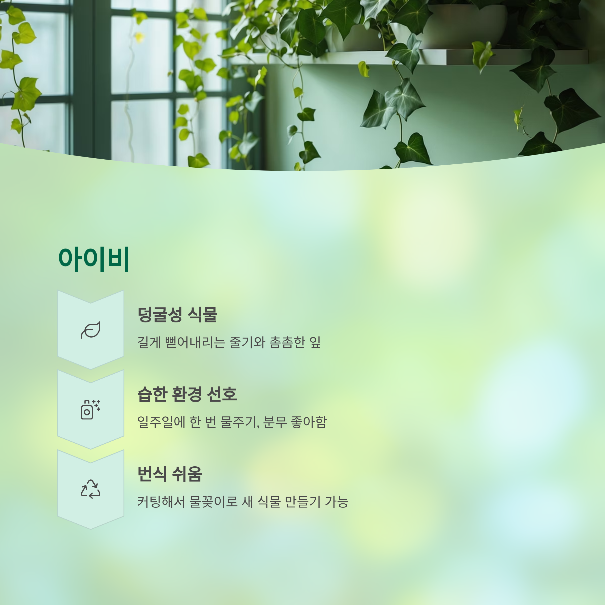 아이비는 키우기 쉽고, 번식도 쉬워서 반려식물 입문자뿐 아니라 ‘식물 수집러’들에게도 인기 많은 식물이에요. 작은 시작으로 식물 생활을 확장해보세요!